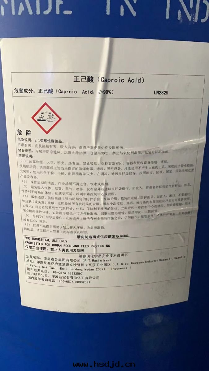 用(yòng)途:一(yī)種(zhǒng)基本(běn)有(yǒu)機(jī)原料,可用(yòng)于(yú)生(shēng)産各(gè)種(zhǒng)己酸(suān)酯類(lèi)産品。醫药中(zhōng)用(yòng)于(yú)制備己雷(léi)琐辛。也(yě)可作(zuò)香料、潤滑油(yóu)的(de)增稠劑、橡胶(jiāo)加工助劑、清(qīng)漆催干(gàn)劑等。